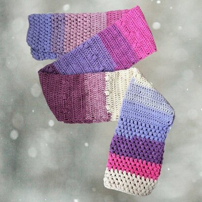 Stay toasty and embrace the cold with this fun textured scarf, just the right length to keep you cosy. This pattern is totally customisable, so you can make it as long or short, wide or narrow, as you like. All that matters is that you have some wind protection when you’re walking!