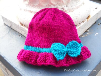 Construction Notes: This cute cloche is a perfect little baby gift that knits up quickly. You can knit two different sizes or two contrasting cloches by alternating your two skeins of Jojoland Tonic Yarn. The hat is worked in the round from the bottom up with a brim that has twice the number of stitches as the cap of the hat. Double pointed needles are recommended for the hat and bow, with the bow worked back on forth on the double-pointed needles.