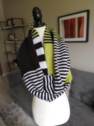 Make a statement & embrace the fun & spookiness of Halloween with this Beetlejuice inspired Infinity scarf! Perfect to wear on those chilly October days & on Halloween night! Super easy to make, its pizazz is in the stripe detailing! It showcases different combinations of 3 colour stripe patterning. So versatile, it can be made in any colour combination to celebrate any season!!