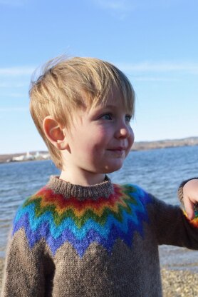 Inspired by traditional Icelandic lopi sweaters, Daydreamer is knitted in the round. Sleeves and body are worked separately, then joined to knit the circular yoke. Raglan decreases and short row shaping are included for an optimal fit. Finally, the stranded chevron yoke is knitted. Daydreamer is a great project for stash busting with lots of possibilities. Use just 2 colors alternating in the yoke, create a gradient effect, a rainbow, or simply use colors of your choosing. Fingering weight yarn. Designed to be worn with 2-4" / 5-10 cm positive ease. Sample size measures 2-3 yrs.