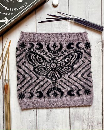 Cowl with death head hawk moth motif (known from the movie silence of the lambs) knitted in the round. You begin with a ribbed cuff. Then knit the mysterious death head hawk moth pattern in fairisle technique with two contrasting colours.