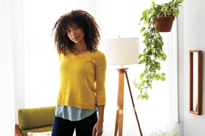 Split hems lead to a body knit in the round, decorated by rows of dandelion stitches. Front and back are completed separately. Shoulders are seamed before stitches are picked up for the three-quarter-length sleeves. Sleeves are also knit in the round, decorated with a row of opposite direction dandelion flower stitches. Stitch pattern is written.
