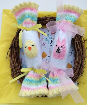 This is a digital knitting pattern for decorative Easter Crackers. They are knitted in the flat using pastel wool and a pair of 4mm needles. They are beginner to intermediate skill level. They have a motifs on each cracker which are filled with a little stuffing to give a 3D effect. These are knitted using the 2mm needles. You can fill these crackers with mini eggs or a small gift. Include these for your table setting at the Easter festivities. The size of the crackers are L23cm / 9". W 6" / 15cm. Black, orange and white embroidery thread is required for the faces. Style craft special Dk wool in lemon, white, spring green and sherbet. A small amount of pastel pink dk wool. This pattern is very versatile as you can change the colours and knit them for Christmas or Valentine's. The size of the cracker can be changed by using a different size needle.