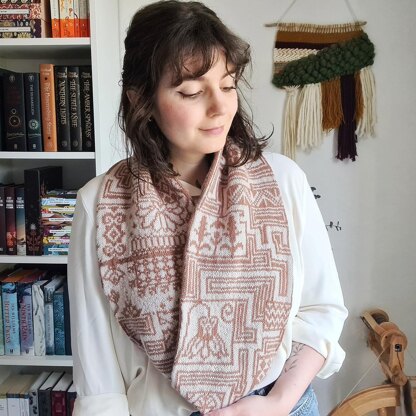 Dedale is a long cowl, started with a provisional cast-on, knitted in the round as a tube and then closed with a grafting at the end. It features stranded colourwork motifs with two colours per round and floats to catch. The colourwork represents a labyrinth. Extra Charts are provided to make the cowl longer without breaking the pattern.