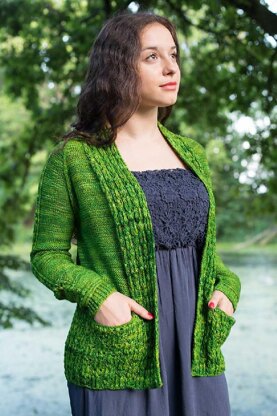 This one (worked top-down in raglan construction – of course seamless, as always) has an interesting textured pattern on the sleeves and the back part of the wide hem. The hem as well as the cuffs are set off by an elegant chained row (easy to make with a detailed picture tutorial), and last, but not least, there are pockets hidden in the hem – just what you need to feel relaxed, but still well dressed!