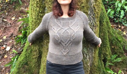This pattern features a unique deer skull cable design. The sweater itself has a deep ribbing to the waist and some shaping to the chest for a close fit. It has raglan sleeves and a crew neckline. The cable design is in chart form, and could be worked on another project (such as a cushion cover). Any Aran / Worsted yarn that knits to the specified gauge of 18 sts x 24 rows may be used.