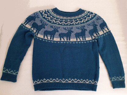 This children‘s sweater is knit from Cool Wool by Lana Grossa. It is worked mainly in stockinette stitch from the top down using 4 colors, but not more than two in a round. No grafting is needed, but you could also work flat after finishing the yoke. Create your favorite colorway!