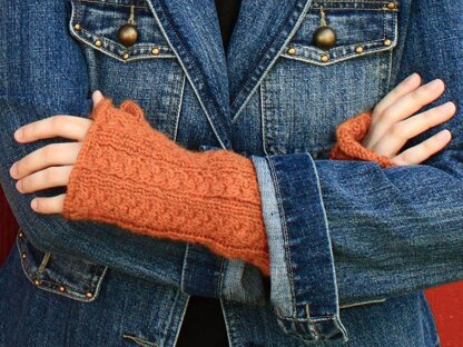 From the Designer's Notebook...Knit in DK/Sport weight yarn using braided cables and ribs, these fingerless gloves are delicately lightweight. The length is perfect for tucking into the sleeves of a jacket or coat to help you stay warm on chilly days. The wide thumbs allow for range of motion and keep typing comfy.