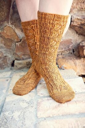 These socks are knit from the top (cuff) down. They feature a heel flap and a wide toe construction. The originals are knit in Wooly Wonka Fibers Arianrhod Sock in the "Butternut" colorway, but any sock yarn with approximately 425-435 yards/100 grams could be used for these.