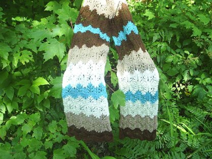 This is a ripple patterned scarf. Using knit Picks palette fingering wt. yarn. This is a modified porcupine stitch, that is not reversible. but has a real pretty look. It has graduated shades of brown to cream with a dash of turquoise thrown in!