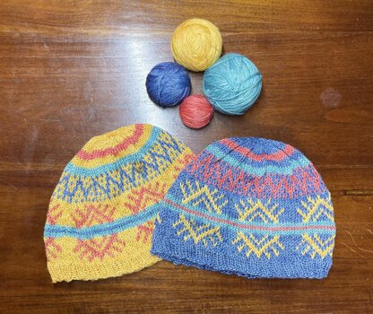 This beanie is a collaboration with Blue Mule Fiber and yes it has the same yarn and designs as the sweater and cowl. The beautiful fingering weight yarn is a blend of Mulberry Silk and Extra Fine Superwash Merino Wool. There is stranded colorwork throughout. There are 2 sizes. The yellow version has a 20 in circumference and the blue version has a 21.4 in circumference.