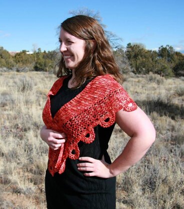 As the sun drops behind the horizon the colors of scarlet and amber inflame the sky, Desert Sunset reminds me of a gorgeous hot night in the desert. Worked from side to side, this crescent-shaped shawl is worked all in one piece including the edging. Using a simple increase in the solid body of the shawl, you can enlarge or reduce the size just by changing the repeats.