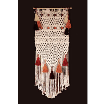 This macrame kit from Design Works Crafts uses knotting techniques to create a decorative banner with coloured tassels and beads. The kit contains 100% cotton macrame cord, wooden beads, dowel rod and finials and clear instructions.