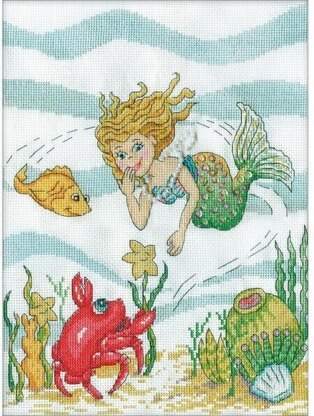Mermaid Cross Stitch Kit.This counted cross stitch kit by Design Works features a cheeky young Mermaid playing under the sea.Your kit contains:14ct white aida fabricStranded cotton threadsCharted design and full instructionsFinished size: 23 x 30 cm.