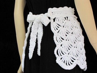 The construction is fun: you make the waistband first (it’s a narrow rectangle). Then, the lacy skirt is crocheted onto it and you stop when it’s the length you prefer. The apron ties are crocheted on last, or add pretty ribbon ties.