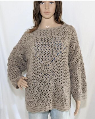 This crocheted, boxy sweater is designed to be slightly oversized, featuring basic single, double and half-double crochet stitches. Make it a sweater, or leave off the sleeves for a vest option! Includes instruction for sizes S, M/L, and XL. It makes up really quick, using worsted weight yarn and K hook.