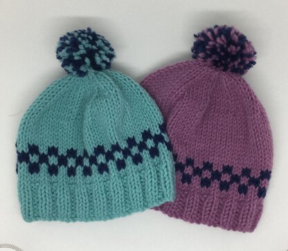 Baby hat with a small amount of Fair Isle, checkerboard patterning.