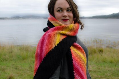The Diaonal Sunset Wrap is a beautiful crochet scarf using only single crochet stitches & picot stitches.