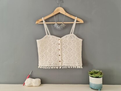 The top is very quick and easy to make with no seams. It is finished off with a dc border, mini pom pom edging along the bottom, straps and buttons sewn on.