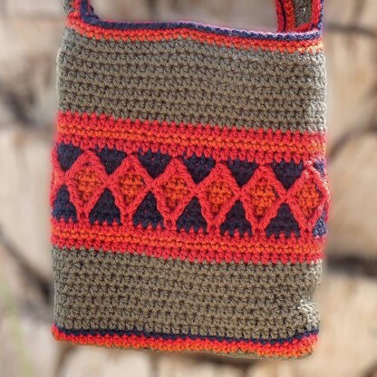 The diamonds, framed with post stitches, can be made with one colour or several, to create a colourful crochet bag.