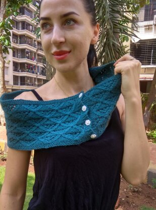 The Diamond Darling cowl is worked flat in one piece from the bottom up beginning with a garter border followed by the diamond lattice lace pattern. The lace pattern is flanked by garter borders at each end. The cowl is fastened off with buttons.