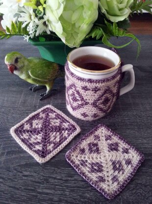 The technique used for this set is tapestry crochet, so the yarn not in use is stitched over by the yarn in use.