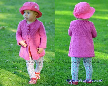 Diamond Drops Cardigan is a perfect addition for your little fashionista’s wardrobe. It is perfect for chilly summer days and can be easily combined with favorite trousers, leggings or pretty summer dress. This cardigan is easy to knit and fancy to wear. It’s bottom up construction features a pretty stitch combination and swingy shape. Front, back and sleeves of the cardigan are knitted separately and the sewn together. The button bands are worked as you go. The pattern is easy to follow and suitable for intermediate knitters.