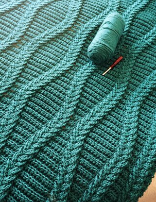 Materials: • Medium worsted weight yarn in color of choice – approx. 3,412 yards (Sample used 10 x 200-gram skeins of 4 Seasons Spotsaver in color, Peacock.) • Crochet hook size L (8.0 mm)