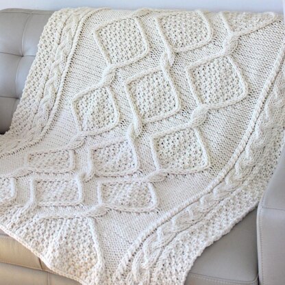 This Diamond Heights Cable Knit Blanket Pattern creates a full-sized cozy throw your family is sure to cherish. Smooth cables rest atop the reverse stockinette and double moss textures.