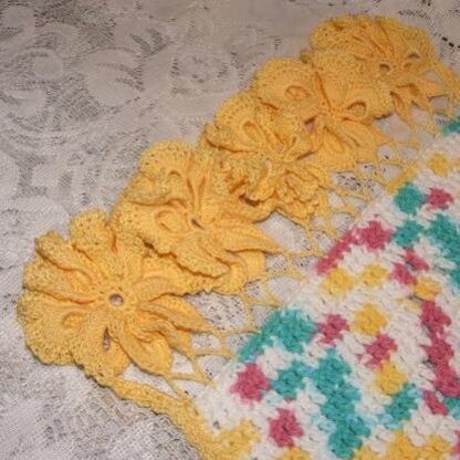 Quick and easy placemats made with cotton yarn and thread trim. Great with the matching napkin rings. You can add the flowers or trim around without the flowers.