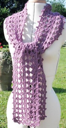 This pattern is made lengthways, so it takes a little time to get started and you need a little care when counting your foundation chain (stitch markers help!). Once you have completed the foundation you will find it works up quite quickly, with only 7 rows and one edging border. I love the diamond pattern (maybe I am a bit obsessed with it!) and have worked it into several items – shawl, wrap, scarves, a cowl, a pair of mitts and a hat, using different weights of yarn. They are all quite adaptable and feature in an ebook covering many variations on the diamond theme. The scarf is 15 cm (6 in) wide by 175 cm (66 in) long when blocked. The pattern is written in English and US crochet terms, and is charted.