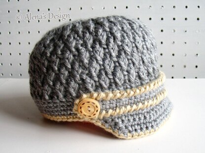 Includes PATTERNS for the Two-Button Baby Visor Hat in four sizes: