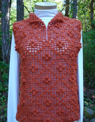 Popcorns in a diamond filet crochet design makes this a perfect casual top. A little bit oversized for comfort, the top can be crocheted quickly and easily from a chart that is included in the pattern.