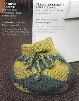 This is a pattern for a diamonds door stop, originally published in Knitting magazine. It has intarsia diamonds and a garter stitch border with eyelets and a tie to secure. It is filled with a lined inner and rice for weight. The base is a circle formed by simple increases. You will need 2 x 50gm balls main, 1 x ball contrast. Photos Knitting magazine.
