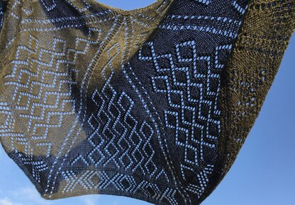 The shape of this shawl is 5/8 of an octagon which helps it stay on the shoulders. It has a diamond lace pattern that grows out through each segment towards the more complex border.