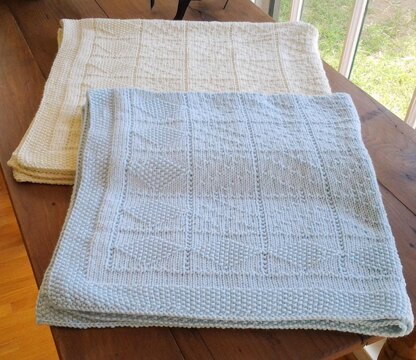 The smaller blanket is approximately 29”x 31" and would make a great car seat blanket. In needs 800-900 yards aran weight yarn. The larger blanket, approximately 36”x 36" in size, would make a great napping blanket and needs 1100-1200 yards worsted weight yarn. Both were knit on a size 7 circular needle.