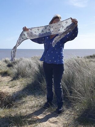 When blocked the scarf measures 170 cm long and 35 cm wide. Gauge is not important with this project and the scarf can be made shorter if required.