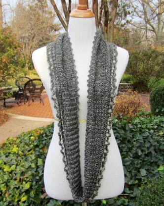 Diana's Cowl is a long, lacy cowl crocheted as a rectangle and then seamed together with slip stitches. Each side of the cowl features a different lace pattern. One side has a ribbed look; the other side has a bumpy look. The inside and outside edgings are added to the cowl last.