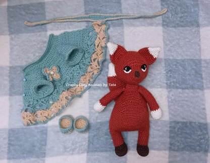 A pattern for crocheting an amigurumi fox and a set of clothes for her (a dress, a headband and a pair of shoes).