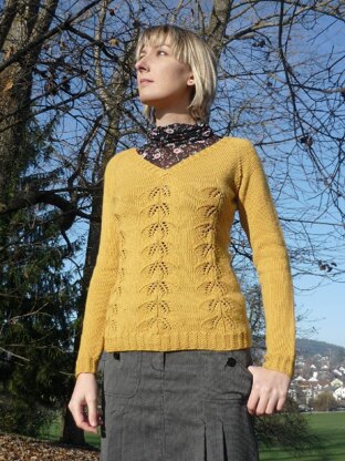 Dijon is a seamless top-down sweater with leafy pattern and cabled ribbing.