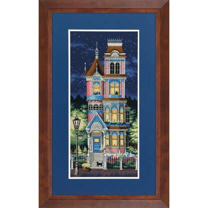 Kit contains chart and instructions, needle, 18 count Navy Aida fabric and stranded cotton threads. Designed by Travis Brown© . Escape to the piquant charm of this inviting getaway where a cat eagerly awaits a friend's arrival on a starlit evening. This charming guesthouse is meticulously detailed on 18 count navy Aida.