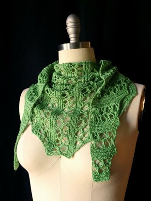 The huge sail protruding from Dimetrodon’s spine practically begged to become a knitted shawl. Ribbed “bones” extend vertically from the long cast on edge, while a lacy “skin” fills in the gaps. Stepped decreases give the shawl its bell shape, and like its namesake’s sail, this shawl is completely reversible!