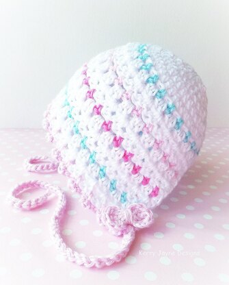 THE Dinky Dot Baby bonnet is just so sweet and girlie, crocheted in a great quality 100% cool cotton yarn in beautiful summer pastel colours! Just right for keeping your littleones head covered in the summer months or can be crocheted in a warm acrylic baby yarn for the winter :-)
