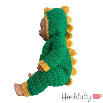 This crochet pattern bundle is for a baby dolls onesie. The doll clothes are suitable for 14” baby dolls. The dolls onesie is crocheted in one piece and the dinosaur spike decorations are made separately and are sewn on that the end. The hooded onesie buttons up the front.