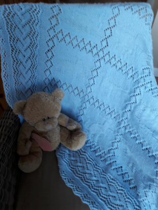 Lightweight shawl, knitted in 4ply yarn in a lace edged and textured dinosaur pattern. Measuring approx 47" square it's ideal for wrapping baby in. It can also be folded to make a lightweight but warm pram/crib/car blanket.