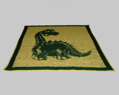 You can only see the illusion dinosaur when you look at the blanket from an angle. When you look straight at the knitting you will see stripes and just the faintest shadow of the creature.