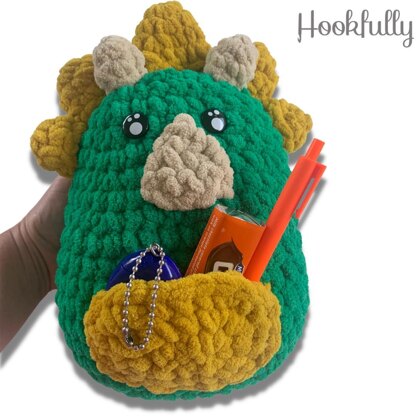 **Dinosaur Squishy** This crochet pattern will help you create a fast and easy dinosaur squishy toy. The triceratops amigurumi is like a small squishy pillow with a pocket for a tummy.