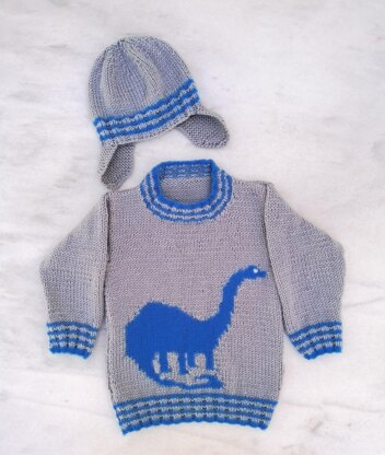 The sweater features a dinosaur (Brontosaurus) on the front and the hat has flaps to keep those ears warm.