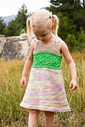 The dress/tunic can be knit in any yarn weight (fingering, dk, worsted, etc…), however certain yarn weights are better suited for certain ages but not others.