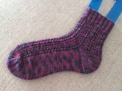 This pattern contains a simple lace pattern for the main body of the sock, a short row heel in garter stitch and a rounded toe for comfort. The pattern comes in three standard sizes: